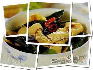 2、炒鍋置火上,注入豬油燒熱(rè),放蔥姜末煸香,加高(gāo)湯燒沸,加海帶結、豆皮結燒5分(fēn)鐘(zhōng),加醬油、鹽、味精、胡椒粉調味,燒至原料熟透入味,撇去浮沫,以水(shuǐ)澱粉勾芡後倒人(rén)碗中,放入紅椒絲即可(kě)。